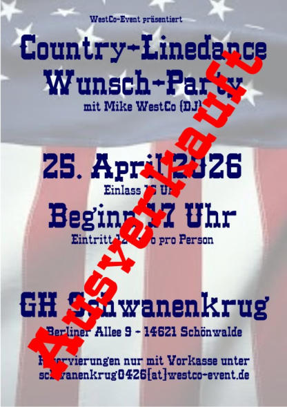 Und es gibt noch mehr Country-Linedance im Schwanenkrug. Getränke, Kaffee & Kuchen und eine kleine Speisekarte für die Versorgung sind gesichert. Einlass 16 Uhr --- Beginn 17 Uhr --- Eintritt 12 Euro pro Person Infos unter schwanenkrug0426@westco-event.de Ablauf Vorkasse: Nach Erhalt der Reservierung wird die Bankverbindung mitgeteilt. Nach Zahlungseingang gibt es die Bestätigung der Reservierung. Sollte wegen neuer Beschränkungen durch amtliche Stellen oder sonstiger äußeren Einflüsse die Veranstaltung abgesagt werden müssen, werden die bereits gezahlten Beträge erstattet. Wir freuen uns schon jetzt auf euch.